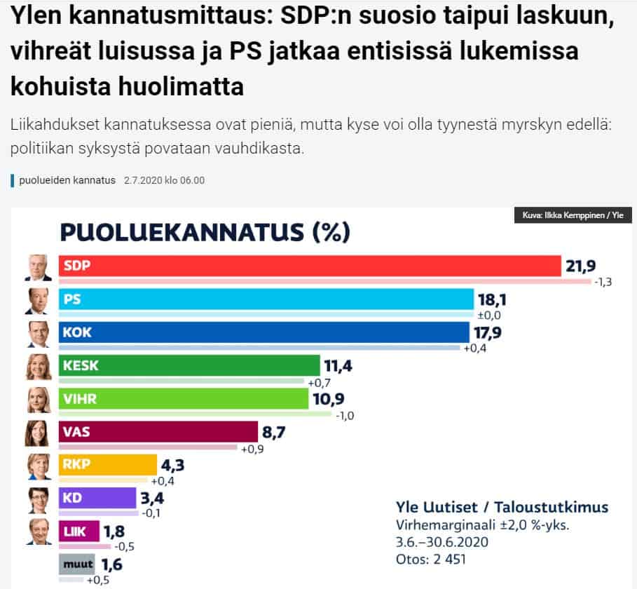 Tämä kertoo vain, että suomalaisten keskuudessa – ikävä kyllä – kysyntää on perussuomalisten sanomalla näille karkeimmillekin. Median on ylläpitänyt kuvaa uhriutuvasta puolueesta. Oikeudellisilla toimilla ei kannattaisi politiikkaa jatkaa, on kesän opetus. Kannatusmittausten ennakointi on verrattavissa sään ennustamiseen ja ihan kun sattumalta kaksi #tieteelliistä# veikkausta aamun telkkarissa: