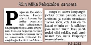 Ja tästä on hyvä jatka siitä mitä RS:n toimittaja Mika Peltotalo on lukenut ja mitä mieltä hän on 9.3.2021 lehdessä
