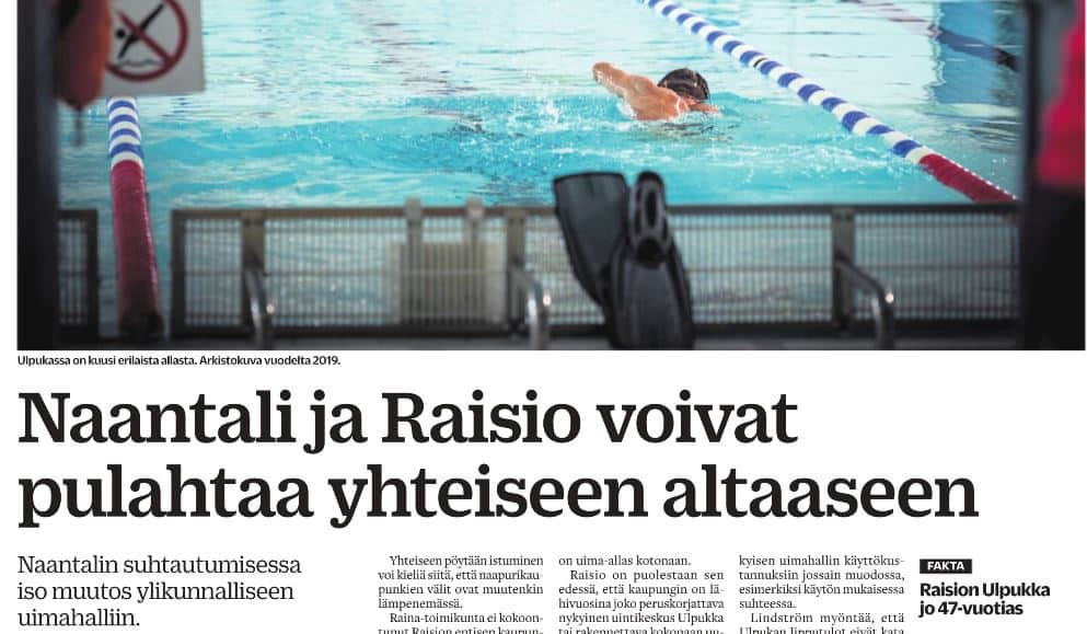 Raision kaupunginjohtaja Ari Korhonen nosti esille uudenlaisen vaihtoehdon ja mallin uuden uimahallin rakentamiseksi Raisioon (TS 12.10.). Naantalin vahva vaikuttaja Mikko Rönnholm antoi tukensa Korhosen yhteistyön avaukselle (Rannikkoseutu 15.10.). Kiitos Ari ja Mikko.