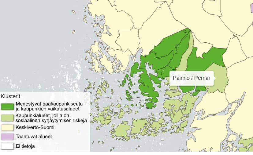 Korkeimmat työllisyysasteet, korkeimmat tulot ja väestönkasvu, korkea yritysten liikevaihto ja pätevin työvoima: Tämä aluetyyppi kasvaa Suomen talouden moottoreiden ympärillä, pääkaupunkiseutu etunenässä. Myös sosiaalinen ulottuvuus on keskimääräistä parempi: hyvin matalat huoltosuhteet ja hyvin matalat lasten köyhyysriskiarvot kulkevat rinnan korkeiden äänestysprosenttien kanssa. Valtaosa talouksista on laajakaistayhteyksien piirissä, sosiaali- ja terveydenhuoltoalan työpaikkojen keskiverto määrä kertoo todennäköisesti suuremmasta sellaisten erikoistuneiden terveydenhoitolaitosten osuudesta, jotka tarjoavat palveluita suuremmille alueille. Jatkuva tulomuutto muista Suomen kunnista ja maahanmuuttajien virta vakauttaa väestöpohjaa, mutta luo myös paineita kaupunkijärjestelmälle. Erittäin korkeat asuntolainatasot ovat tässä varhainen varoitusmerkki: Kasvu johtaa kilpailuun kohtuuhintaisen asumisen kaltaisista resursseista. Korkea kysyntä johtaa elinkustannusten nousuun.