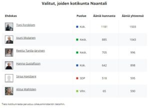 Kokoomus oli selvä ykkönen ja sen kannalta Varsinais-Suomi ja Naantali olivat puolueen perinteisesti vahvoja alueita. Myös alhainen äänestysprosentti pelaa Kokoomuksen pussiin.