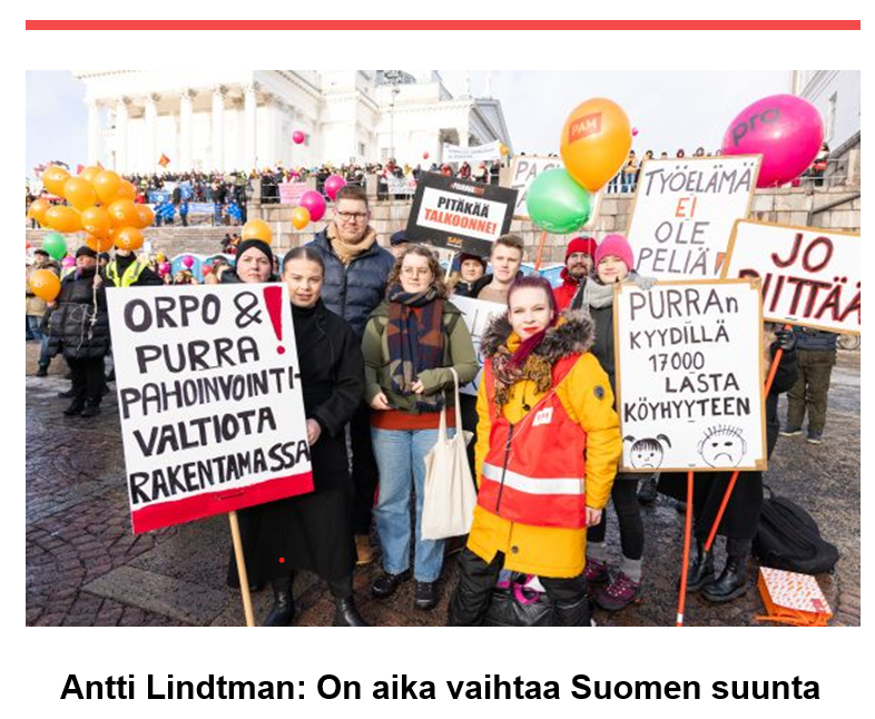 ”On aika lopettaa riidan kylväminen, pelottelu ja nyrkin lyöminen pöytään. Hallituksen pitää lyödä kättä päällä ja palata neuvottelupöytään. On aika vaihtaa Suomen suunta. Jos hallitus ei tätä tee, SDP jättää eduskunnassa välikysymyksen ja esittää epäluottamusta heille, jotka ovat työntekijät pettäneet”, Lindtman lupasi suomalaisille.
