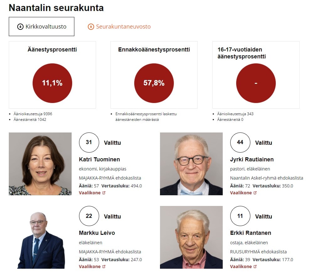 Olen samaa mieltä äänestys aktiivisuudesta, mentiin Naantalissa pohja lukemiin 11,1% kun viimevaaleissa 13.7 % . Vaikka äänestys ikäraja on laskettu 16 vuotta täyttäneisiin, oli tulos nolla. Mielestäni kirkon yläpäänjohdon piispoja myöten otettava asia vakavuudella. Olemme liian vanhollinen yhteisö. Kirkkolaki olisi ensisijaisesti uusittava, esimerkiksi maallikot johtamaan seurakuntaneuvostoja ja yhteistä kirkkoneuvostoa. Tämä on yksi esimerkki. Onko nykyinen jumalanpalvelus-elämä aikansa elänyt?