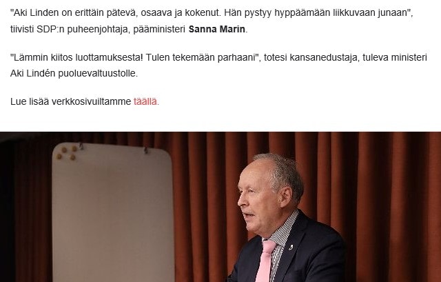 ”Aki Linden on erittäin pätevä, osaava ja kokenut. Hän pystyy hyppäämään liikkuvaan junaan”, tiivisti SDP:n puheenjohtaja, pääministeri Sanna Marin.