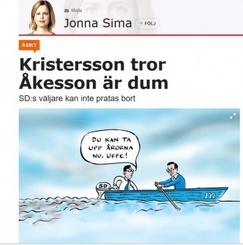 Vaikeuksien taustalla ovat ruotsidemokraattien asema oikealla laidalla. Moderaatit (Ruotsin Kokoomus) Kristerssonin johdolla on yrittänyt taiteilla ilmoittamalla, että oikeistoradikaalien tuki kelpaa, mutta vaikutusta politiikkaan ei se tarkottaisi. Piirroksen viesti onkin, että eihän se näin mene; Jos Åkesson tämän hyväksyy, tarkoitta se, että kaikki ei ole sitä miltä näyttää. Ruotsi on sen verran avoin yhteiskunta, että paljastuminen voisi olla keskiryhmille kohtalokasta. Ehkä siksi sosialidemokraatit ovat sittenkin niille pienempi paha.
