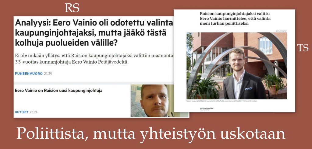 Reippaasti ja rohkeasti ja aikataulussa Raisio sai valituksi uuden johtajan. TS:n ja RS:n kommenteissa oli yhteistä henkeä ja eteenpäin katsetta. Se lupaa hyvää, MUTTA TOISAALTA?