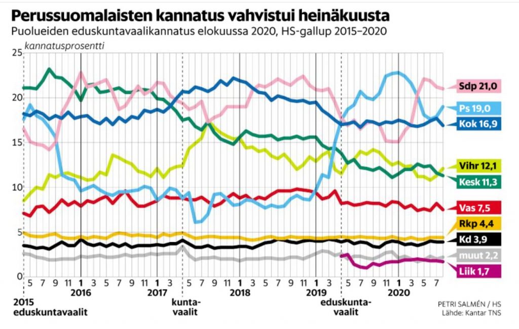 Hesari kommentoi, että Perussuomalaiset onnistuivat hyödyntämään EU-tukipaketin ja puolestaan epidemia pitää SDP:n ykkösenä. Sitten ihmeteltiin Kokoomuksen kannatuksen laskua. Ja se ei taas ole mikään ihme. Kokoomus yrittää monikärkisellä toiminnalla; yhtäällä se naisenergialla yrittää olla köyhän asialla ja toisaalta se EU-kritiikki on persujen matkimista.