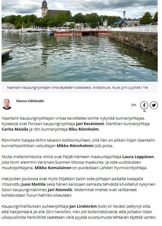 – Joukossa on kuitenkin useita hyviä hakijoita. Uskon, että valittava löytyy tältä listalta. Suostumuksensa antaneita ehtii vielä ilmestyä lisää, tuumii Lindström, jonka mukaan kaupunginhallituksen on tarkoitus valita haastateltavat 11.1. kokouksessaan. Verkkolehti 28.12.20202 ja PrinttiTS 29.12.2020