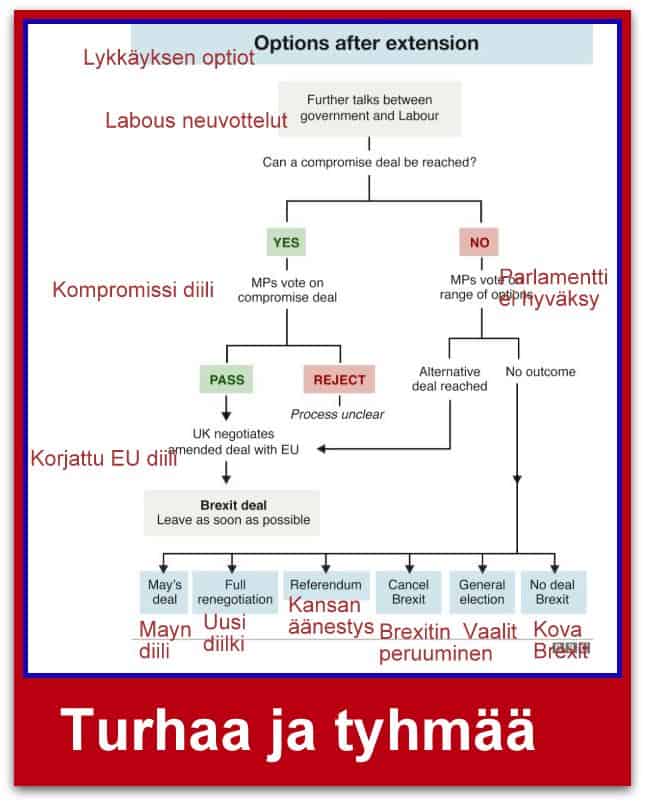 - Kolmas juttu: Mitä nyt sitten: BBC:n kaavio kertoo, että vaihtoehtoja on ja että lopputulos on epäselvä.