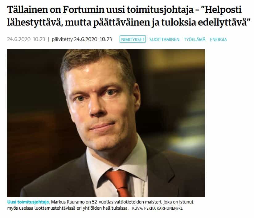 Markus Rauramon valinta Fortumin johtoon on hyvä uutinen mutu perusteella.