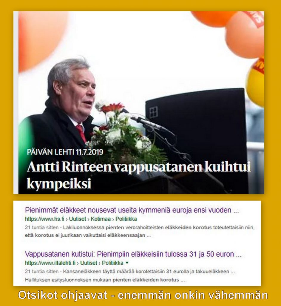 Naurattavalta tuntuu, että nyt nekin, jotka oat moittineen lupauksia holtittomina talouden hoidon kannalta, ovat vaatimassa niiden toteuttamista. Sellaista politiikka on.