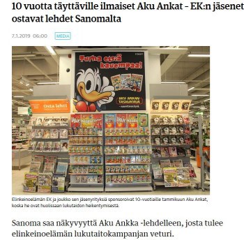 Aku Ankan on ilmestynyt Suomessa vuodesta 1951. Vuonna 2017 lukijamäärä oli 574 000 eli enemmän kuin millään muulla yleisaikakauslehdellä. Väkilukuun suhteutettuna missään päin maailmaa ei lueta Disney-sarjakuvia yhtä paljon kuin Suomessa. Erityisesti lehdessä käytetty rikas suomen kieli on saanut kiitosta, ja se sai vuonna 2001 Helsingin yliopiston suomen kielen laitoksen vuosittain jakaman Kielihelmi-palkinnon.Wikipedia
