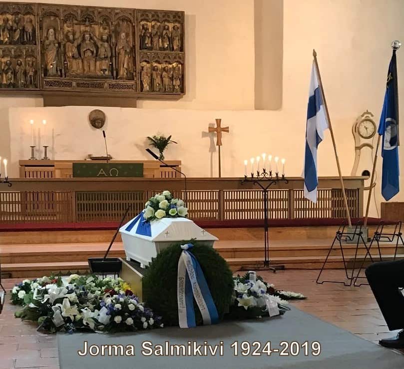 Kunniajäsen Jorma Salmikiven siunaus toi aamuvarhaiseen kirkkoon poikkeuksellisen runsaan saattoväen. Omaisten, sukulaisten ja ystäväin suru sekä järjestöjen kiitollisuus olivat läsnä.