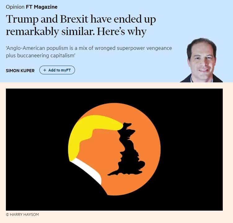 Simon Kuper kolumnissaan kirjoittaa Trupin ja Brexitin ilmiön yhtäläisyyksistä. Hän laati 19 kohden listan joista tässä pari ensimmäistä ja viimeinen: