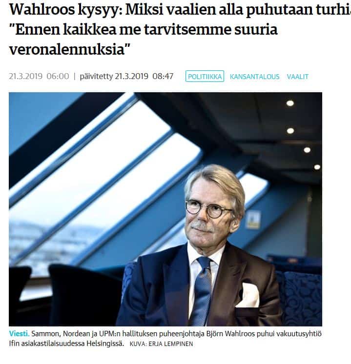 ”Hyvinvoinnin nostamiseksi maahan pitää saada investointeja. Investoinnit, teollisuus, talous ja talouskasvu luovat hyvinvointia, eivät sosialidemokraatit”, Wahlroos viesti äänestäjille.