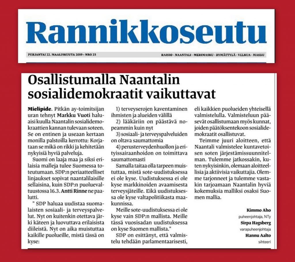 Saman mallista NTY esitteli viime yleisen kokouksensa 10.3.2019 Rannikkoseudun kannanotossaan, jota Vuotin kirjoitus käsitteli, ja jossa hän vertasi Kokoomuksen malliin, joka on tehty Sipilän hallituksen kaatumisen 8.3.2019 eli myös naantalilaisten demareiden linjauksen jälkeen.