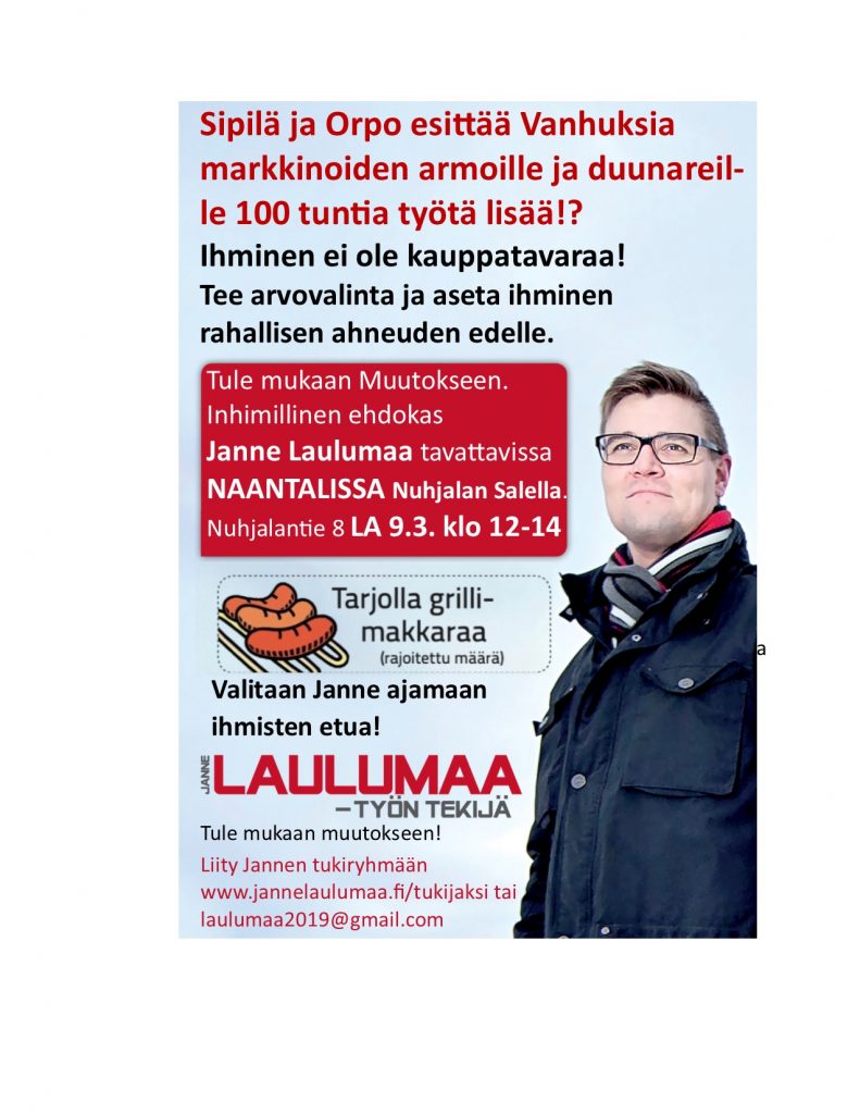 Raision valtuuston puheenjohtaja ja ay -aktiivi Janne Laulumaa kiertää ahkerasti tukiryhmänsä kassa vaalipiiriä. Hän on Naantalilaisten tavattavissa. Käyttäkää tilaisuus hyväksenne.
