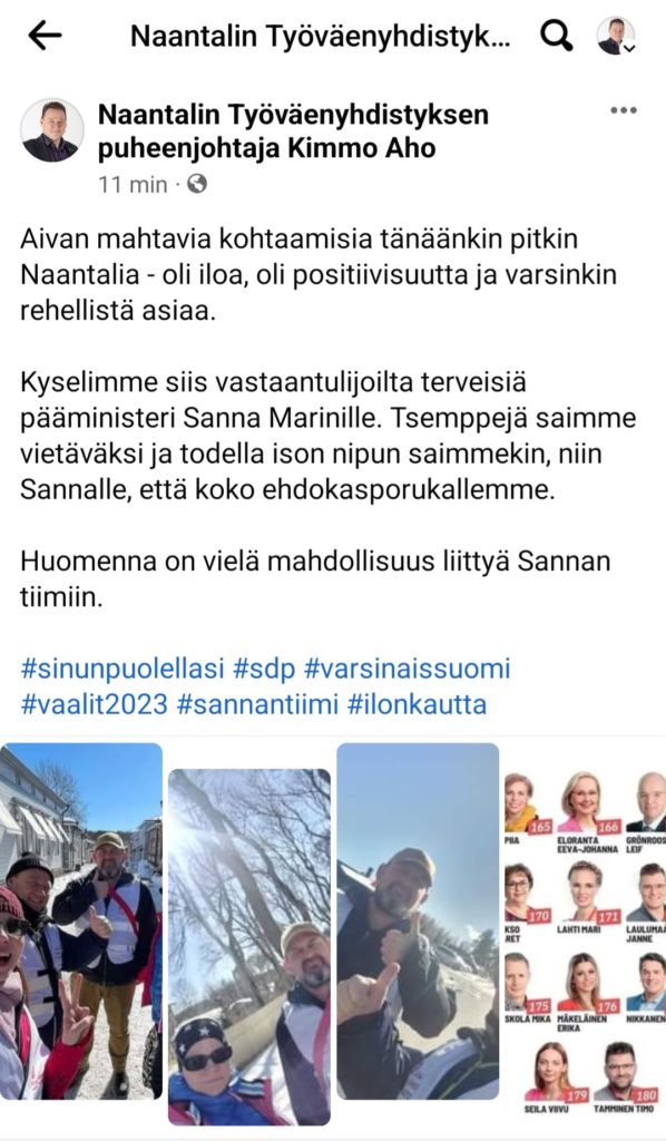 NTY:n puheenjohtaja tervehtii FB-sivuilla jäsenistöä ja innostaa loppukiriin.’