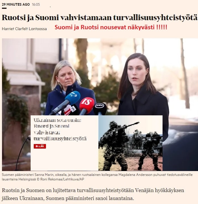 Sanna Marin sanoi yhteisessä tiedotustilaisuudessa ruotsalaisen kollegansa Magdalena Anderssonin kanssa, että ”Venäjän sota suvereenia eurooppalaista kansakuntaa vastaan vaarantaa Euroopan turvallisuusjärjestyksen”, Reuters raportoi.