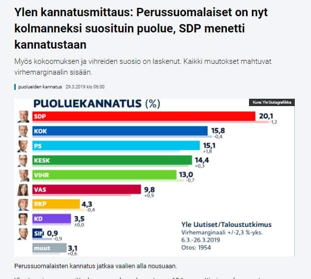 SDP on ollut kovan ja laaja-alaisen vastakampanjoinnin kohteena. Erityisesti Antti Rinnettä on tölvitty Ylestä keltaiseen lehdistöön. Mistään syvällisesti ei ole paljoakaan puhuttu. Pirun yksityiskohtana on ollut mitätön mutta tunteita nostattava lihavero. Myös metsähakkuut ja polttomoottoreista luopuminen ovat olleet puheena erityisesti perussuomalaisten toimesta. Arvelen, että hallituspuolueiden Kokoomuksen ja Keskustan innostuminen samoista asioista ja SDP:n kimppuun käyminen on ehkä vaikuttanut SDP:n kannatukseen jonkin verran. Sen sijaan aivan ilmeisesti onnettoman hallituksen johtajat Sipilä ja Orpo tähän oljen korteen tarttumalla ovat antaneet apua erityisesti Halla-ahon porukalle. Tällä saralla ei voi populisteja paremmin menestyä.