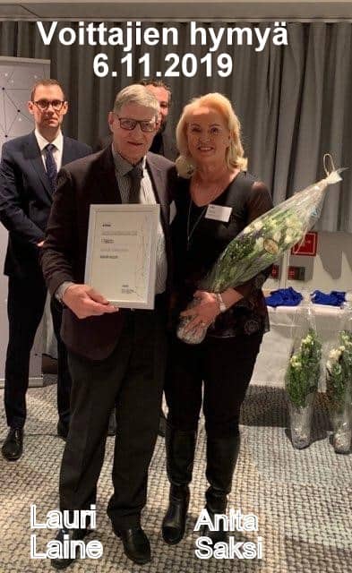 Tarkastuslautakunnan puheenjohtaja Anita Saksi varapuheenjohtaja Lauri Laine ottivat vastaan palkinnon 6.11.2019 Helsingissä.