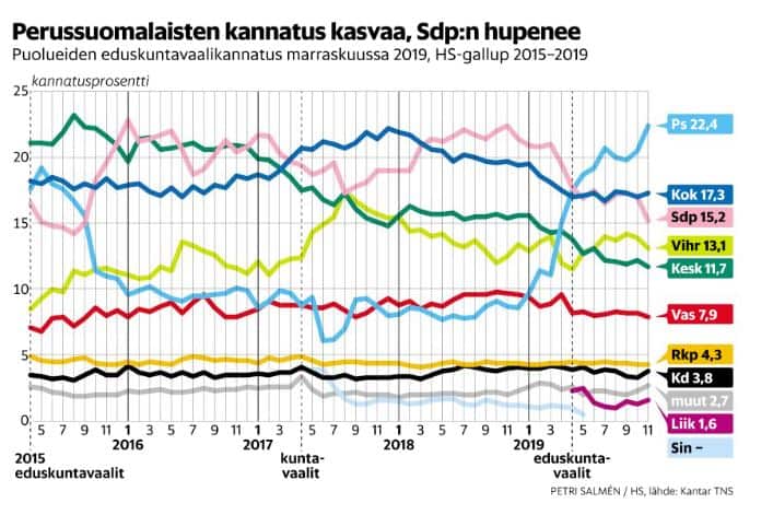 Nurmelan mukaan voi arvioida, että perussuomalaisia eduskuntavaaleissa äänestäneistä melkein 539 000 henkilöstä 490 000 antaisi puolueelle äänensä nytkin. Tämän lisäksi perussuomalaiset on voittanut puolelleen vaalien jälkeen vajaat 40 000 sosiaalidemokraattia, runsaat 30 000 keskustalaista ja 20 000 kokoomuslaista. Ja todetaan nyt vielä kerran, että nämä luvut ovat karkeita arvioita.