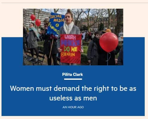 Pilita Clark lopetti kolumninsa FT:ssä (oheinen kuva) omaan tasa-arvovaatimukseen.