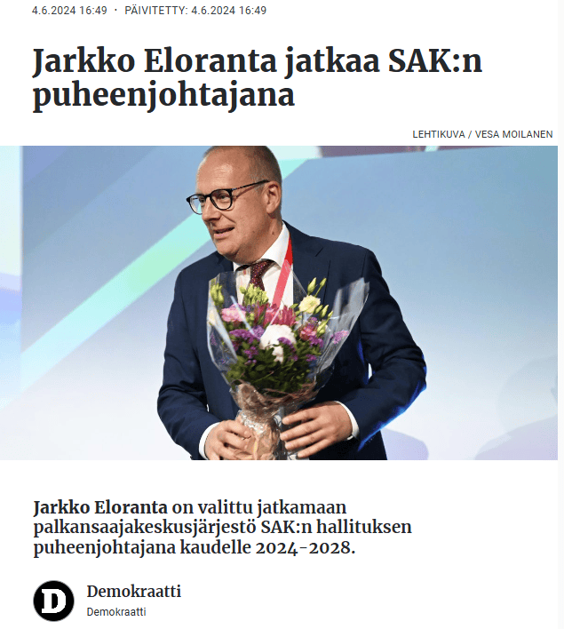 Elorannan Jarkko Railin poika Naantalista valittiin uudelle kaudelle SAK:n johtoon.