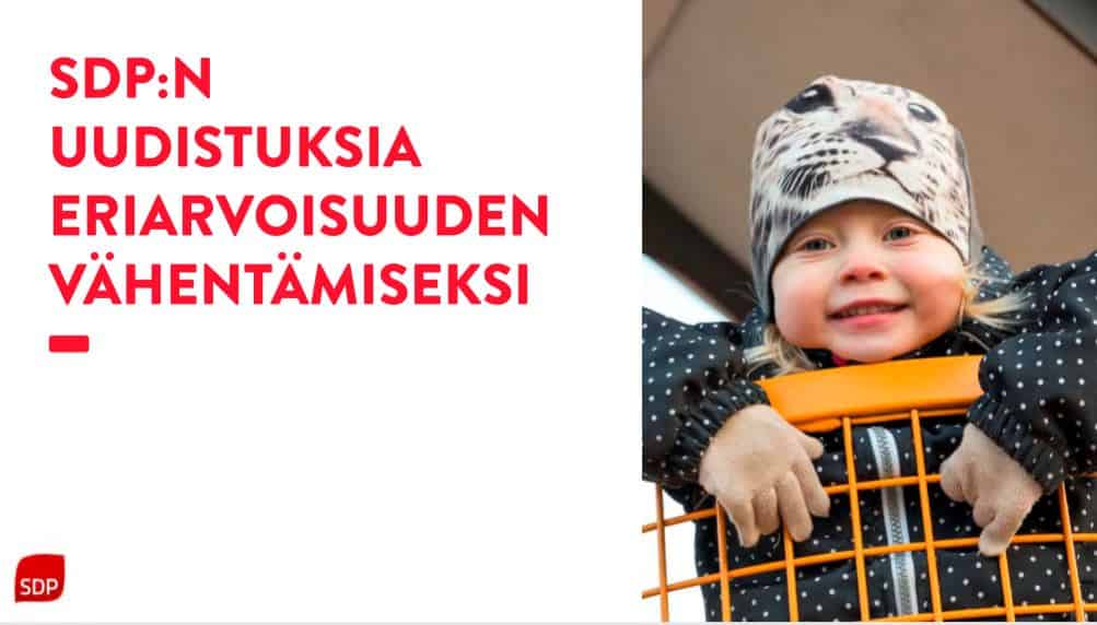 SDP haluaa vahvistaa eläkeläisten ostovoimaa. Kenenkään ei pidä joutua valitsemaan ruoan ja lääkkeiden väliltä. - Luodaan poikkihallinnollinen ohjelma, joka seuraa eriarvoisuuden kehitystä, arvioi politiikan vaikutusta ja tähtää eriarvoisuuden vähentämiseen.