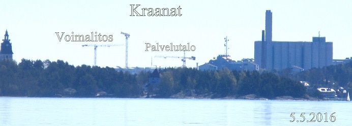 Naantalin kaupungin kevätjuhlissa kysyttiin palstalla olleista torninostureista. Kuvassa, joka oli otettu Väskin takaa, näkyivät TSE:n mopon kraanat. Palvelutalon ovat lähempänä ja näkyvät tässä vastavalokuvasta.