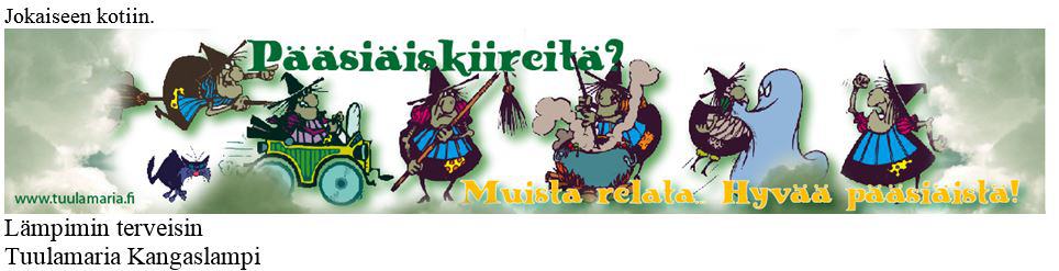 On ilo ottaa vastaan mukavia tervehdyksiä ja kun siinä lukee vielä, että joka kotiin, niin Röölän kylätoiminnan veturin Tuulamarian viestin sanomaan yhtyen lähetämme terveisiä erityisesti niille, jotka pientä hengenvetoa tarvitsevat.