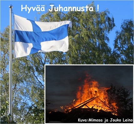 Oheinen Mimosa ja Joukon Leinon kuvakollaasitoivotus muistuttaa Naantalin juhannusperinteistämme: