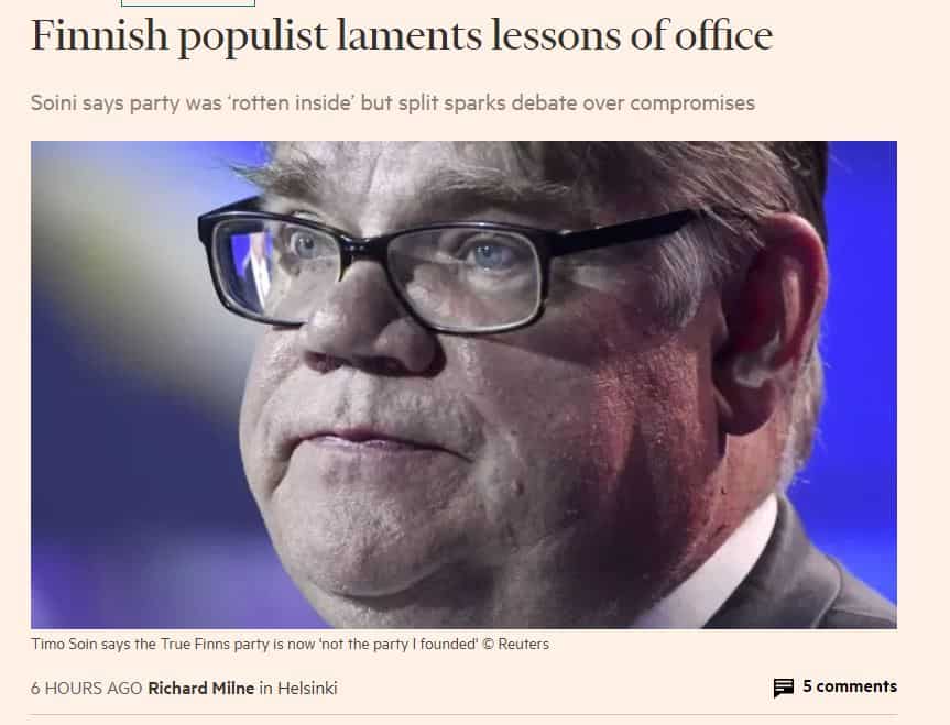 Sitä saa mitä tilaa, oli Soinin sloogan. Hän kokosi puoluessen kaikki mahdolliset ääntenkerääjät ja saavuttu toiseksi suurimman puolueen asemaan päästen hallitukseen ja saaden ulkoministerin loistopaikan. Monia herroja ei voi palvelle, eikä elliitiä voi vastustaa eliitistä käsin. Taisi haastattelussa Soinikun viitata, että puolue oli mätä sisältä.