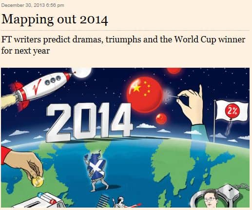 Tänäkin vuonna ennustetaan, että Japanin Abenomics ei nosta inflaatiota siellä kahteen prosenttiin ja, että Brasilialla on parhaat mahdollisuudet jalkapallon voittoon. EU-vaaleista tulee anti-EU puolueille voitto ja öljyn hinta pysyy yli 100 dollaria tynnyriltä.