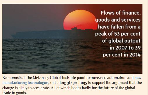 Maailmankauppa on ollut Suomelle mahdollisuus ja on edelleen, mutta ei automaattisesti eikä helpommalla. Kaupan suhteelliset volyymit laskevat, kuten Shawn Donnan artikkelin grafiikka kertoo.