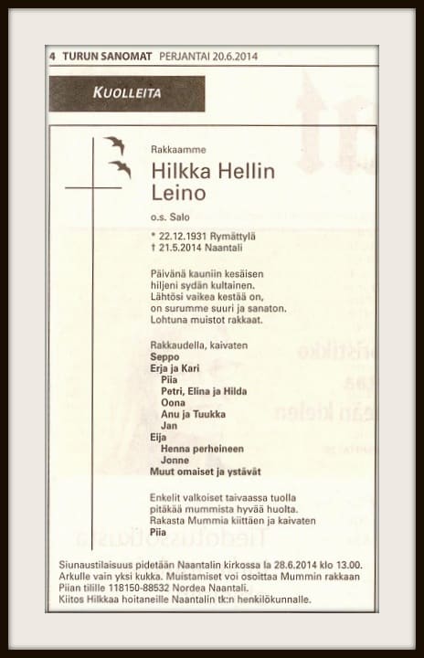 Valitettavasti en pääse hautajaisiin, mutta adressin lähetin. Piialle ja