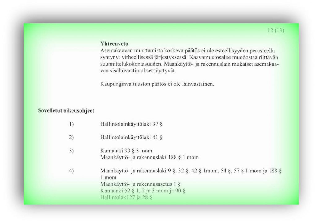 Kaavan sisällön osalta kaava on oikeuden mukaan laadittu voimassa olevien muiden kaavojen ja lakien vaatimusten mukaisesti. Melu ym. selvitykset katsottiin riittäviksi.