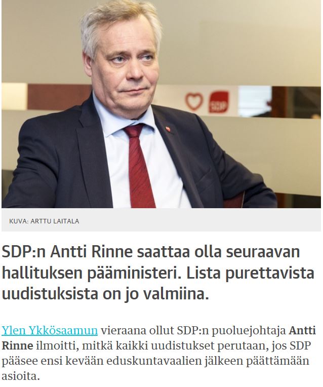 viittaa kommentillaan oppositiopuolue SDP:n puheenjohtajan Antti Rinteen