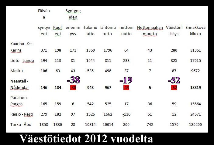 Naantali on Turun seutukunnan muuttotappiokunta. Naantalissa syntyviä on vähemmän kuolleita. Surkea esitys, muuta ei voi sanoa ja taulukko on on pantava mustiin kehyksiin.