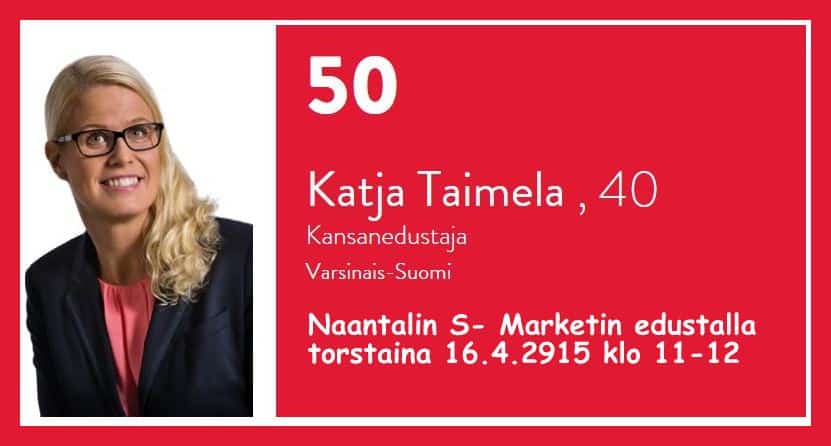 Torstaina 16.4.2015 S- Marketin edustalla on tavattavissa Katja Taimela Salosta. Katja on ollut jo kaksi kautta eduskunnassa ja joutunut hoitamaan Salon vaikeita asioita. Nyt on hyvä mahdollisuus tavata nykyinen ja tuleva kansanedustaja!