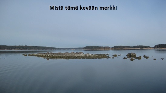 Kevään merkkejä seuraamme monella eri tavalla. Luonto heräilee ja  aina silloin tällöin tulee näkyviin useimmiten piilossa olevia kohteita, kuten kuvassa oleva kari. Kuva on tältä päivältä, mutta mistä ?