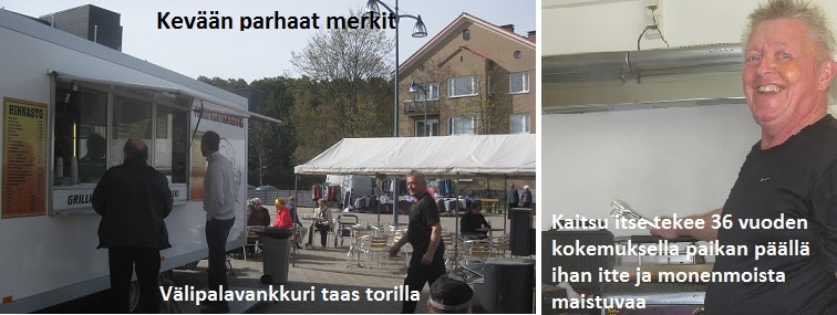 Luontoakin merkittävimmin meihin vaikkuttavat sosiaaliset kevään merkit, joitten ensi airut torilla on välipalavankkuri. Uskollinen ystävämme tulee vappuna ja lähtee syyskuun lopulla. Torikahvila on tuttujen ja satunnaisten kävijöiden kohtauspaikka, sellainen arkiolohuoneemme.