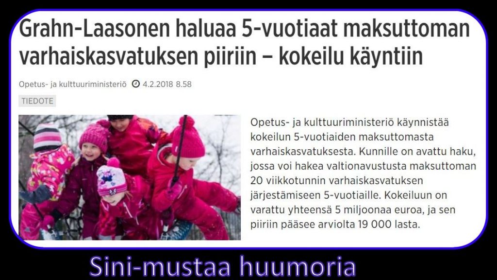Opetusministeriön tiedoitteessa ministeri hehkuttaa varhaiskasvatuksen puolesta, Naantalin opetuslautakunnassa virkamies ei ehdota eikä Kokoomus kannata masuttoman varahaiskasvatuksen kokeilua.