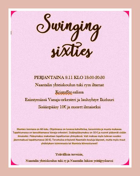 60-luku. Ohjelmassa on luvassa kahvittelua, tanssimista ja muuta mukavaa.