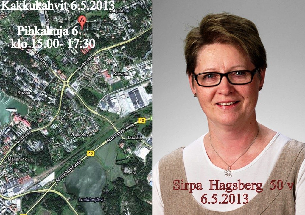 Ohessa Sirpan synttärikutsu uudistettuna: Kakkukahvit 6.5.2013 klo 15.00-17.30 Pihkakuja 6.