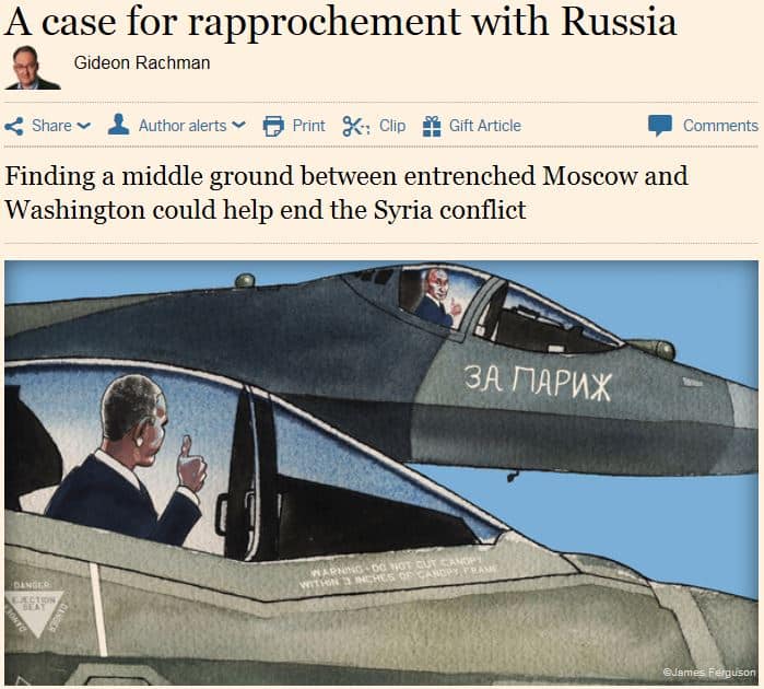 Gideon Rachman kirjoittaa Venäjän ja USA:n lähentymisestä varmaan jotain sellaista, mitä meillä päin pidettäisiin suotavana siitä huolimatta, että Krimin vei luottamuksen. Rachman kuvaa tilanteen kehittymistä selkeästi: