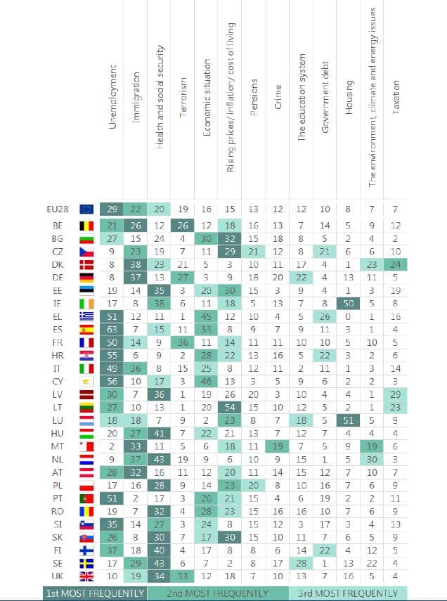 huolestuttivat keskimääräistä enemmän työllisyystilanne (43 % vs. EU28: 33 %),