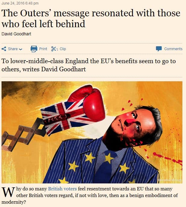 FT artikkelissa väitetään, että tämä on 21. vuosisadan merkittävin luokkaäänestys; mitä alempana yhteiskunnan rapusille, sitä varmemmin äänesti EU:stä lähtemisen puolesta.