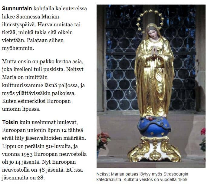 Hesarin kulttuuritoimittaja kirjoitti eilen Marian ilmestyspäivästä ja samalla muistutti EU:n tähtisymbolin alkuperästä. Onkohan tämä yhteys avautunut viime aikoina sordinossa EU:sta puhuvalle katoliselle Timo Soinille.