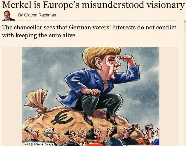Angela Merkel on varovainen, mutta kova peluri, jolla ei ole tapana epäonnistua. Hän pragmaattinen tiedemiesmäinen yrityksen ja erehdyksen kautta toimiva. Talouden ongelmiin hänellä ei ole reseptiä, on melko yleinen näkemys. On myös toisenlaisiakin näkökulmia, jonka mukaan häntä pidetään visionäärinä.